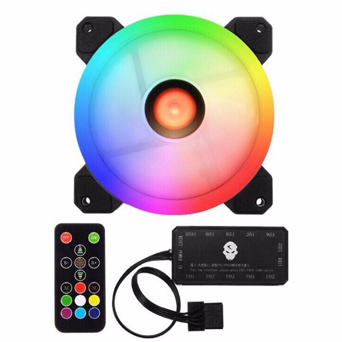 Sản phẩm bao gồm: 05 Quạt RGB, 01 HUB (có thể lắp tối đa 10 Fan), 01 Điều khiển màu sắc từ xa, bộ đủ ốc bắt Fan